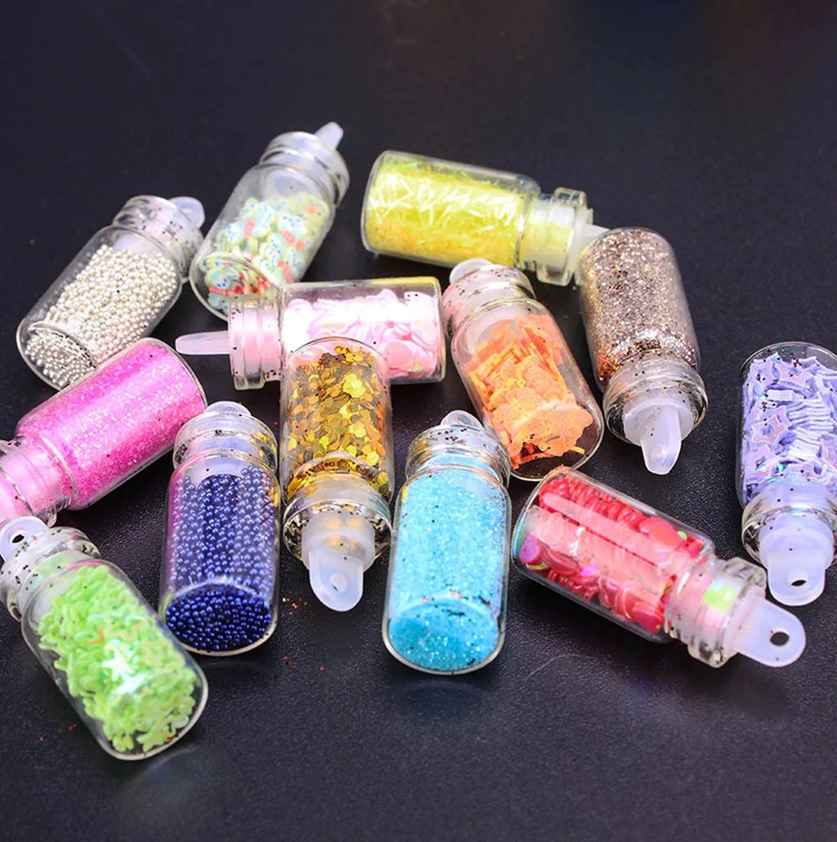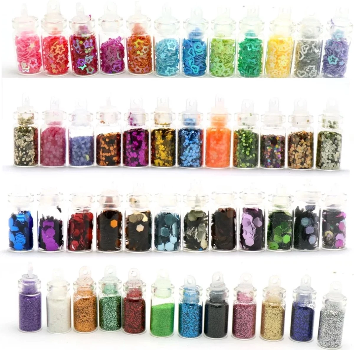 Style je nagels op alle mogelijke manieren! 48 potjes met verschillende soorten decoratieve elementen om je nagels mee te stylen, waaronder glitters.
