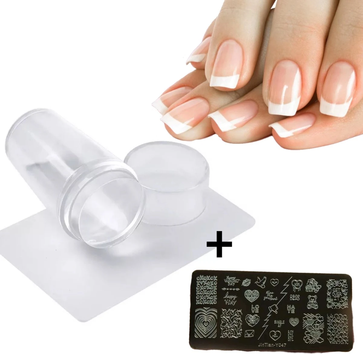 Duw de top van de nagel in de stempel voor mooie french nails. Voor een patroon op de nagel, lak een laagje over de stempelkaart en duw de nagelstempel erin, druk dit patroon daarna op de nagel.