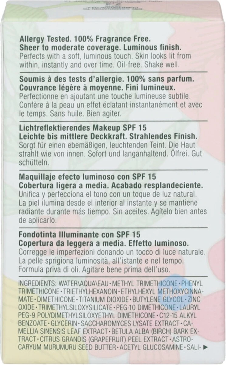 WaterAquaEau , Methyl Trimethicone , Phenyl Trimethicone , Triethylhexanoin , Ethylhexyl Methoxycinnamate , Dimethicone , Titanium Dioxide , Butylene Glycol , Zinc Oxide , Trimethylsiloxysilicate , Peg-10 Dimethicone , Lauryl Peg-9 Polydimethylsiloxyethyl Dimethicone , C12-15 Alkyl Benzoate , Glycerin , Saccharomyces Lysate Extract , Camellia Sinensis Leaf Extract , Betula Alba (Birch) Bark Extract , Citrus Grandis (Grapefruit) Peel Extract , Astrocaryum Murumuru Seed Butter , Acetyl Glucosamine , Salicylic Acid , Jojoba Esters , Methicone , Caprylyl Glycol , Yeast ExtractFaexExtrait De Levure , Polyglyceryl-6 Polyricinoleate , Caprylyl Methicone , Dimethicone/Peg-10/15 Crosspolymer , Sodium Chloride , Tocopheryl Acetate , Sodium Hyaluronate , Dipropylene Glycol , Dimethicone Crosspolymer-3 , Lecithin , Magnesium Ascorbyl Phosphate , Tetrahexyldecyl Ascorbate , Stearic Acid , Disteardimonium Hectorite , Isopropyl Titanium Triisostearate , Aluminum Hydroxide , Laureth-7 , Disodium Edta , Phenoxyethanol , [+/- Mica , Iron Oxides (Ci 77491) , Iron Oxides (Ci 77492) , Iron Oxides (Ci 77499) , Titanium Dioxide (Ci 77891) , Bismuth Oxychloride (Ci 77163)]