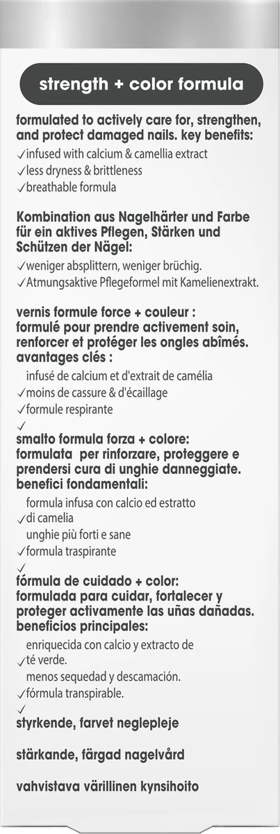 - *Klinische test: na drie (3) dagen gebruiken: minder droge/breekbare nagels, verbeterde nagelsterkte en verbeterde algehele gezonde uitstraling van de nagels
